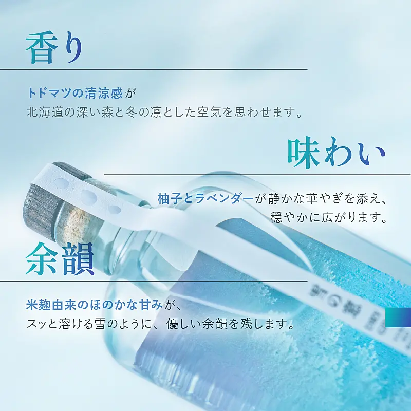 雪の窓から差し込む、朝の光を思わせる東川米のほのかな甘みと、トドマツや柚子の清涼な香りが重なります。