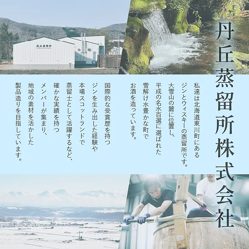2025年夏にオープンした、北海道東川町にあるジンとウィスキーの蒸留所です。大雪山の麓に位置し、「平成の名水百選」に選ばれた雪解け水豊かな町で、お酒を造っています。