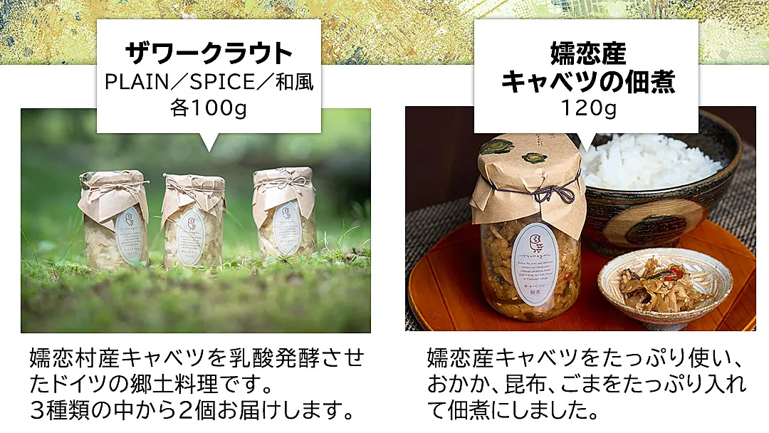 嬬恋村キャベツ農家のこだわりザワークラウト『プレーン』『和風』『スパイス』の中から2種をお届けします。