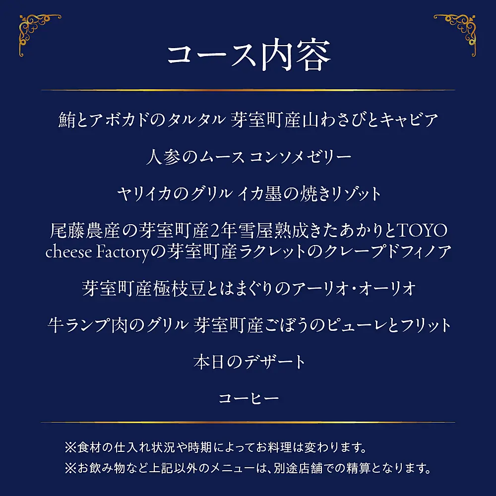 本コースは、シェフが芽室町の一次生産者の現場を訪れ、目利きした厳選食材をフルに活用した特別コースです。