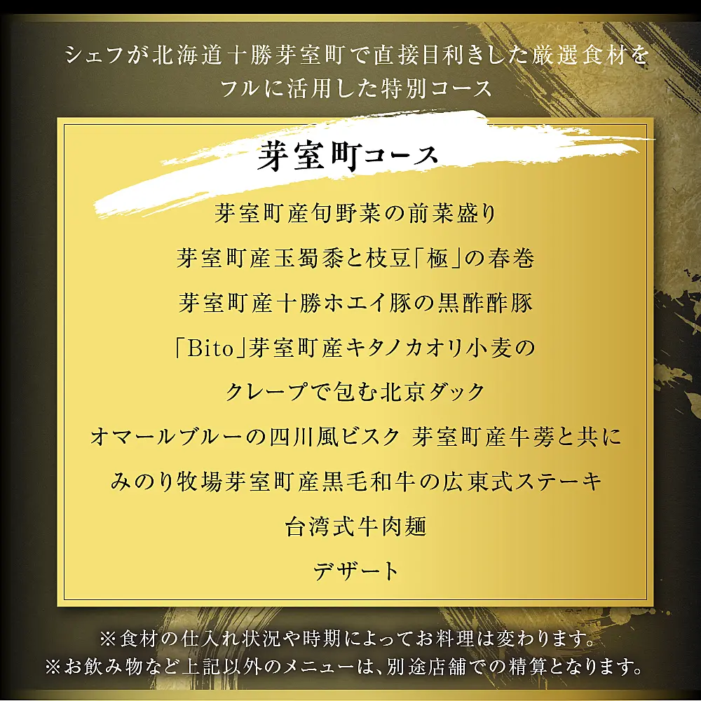 本コースは、シェフが芽室町の一次生産者の現場を訪れ、目利きした厳選食材をフルに活用した特別コースです。