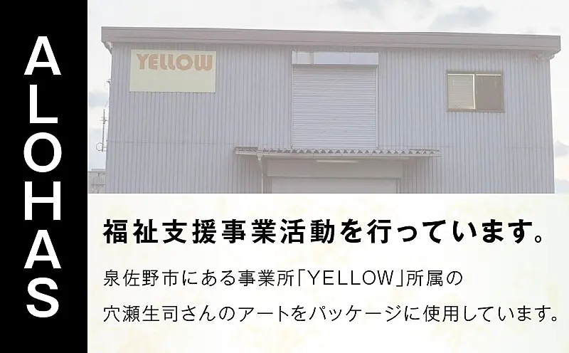泉佐野市に拠点がある事業所「YELLOW」所属、穴瀬生司さんのアートを使用し、パッケージにデザインを施しています。また梱包出荷作業を障がい者の方が作業し、皆様の元へお届けします。