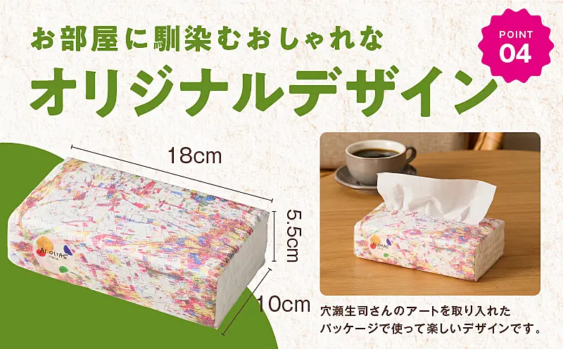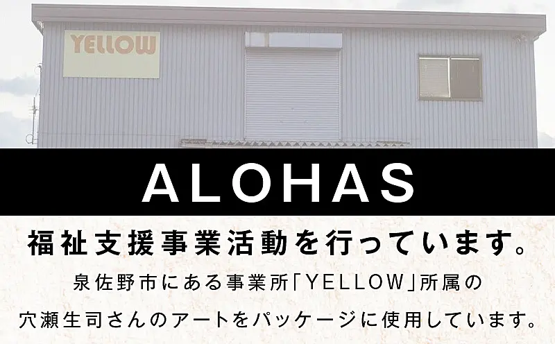 泉佐野市に拠点がある事業所「YELLOW」所属、穴瀬生司さんのアートを使用し、パッケージにデザインを施しています。また梱包出荷作業を障がい者の方が作業し、皆様の元へお届けします。