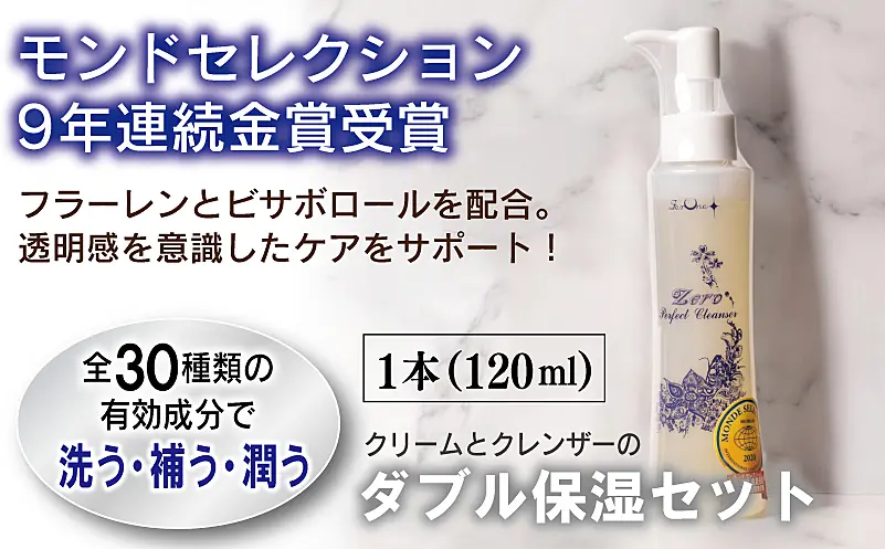 Zero Perfect Cleanser:水・ココイルグリシンK・コカミドプロピルベタイン・ラウロアンホ酢酸Na・コカミドDEA・塩化Na・フラーレン・ローズウッド木油・グレープフルーツ果皮油・スイートオレンジ油・ラベンダー油・セイヨウハッカ油・乳酸桿菌/セイヨウナシ果汁発酵液・ビサボロール・アロエベラ液汁末・ビルベリーエキス・サトウキビエキス・レモンエキス・オレンジエキス・グレープフルーツ果実エキス・サンザシエキス・ナツメ果実エキス・リンゴエキス・バチルス発酵物・サトウカエデ樹液・トコフェロール・グリセリン・BG・PG・ライム果汁・オレンジ果汁・レモン果汁・エチルヘキシルグリセリン・PVP・安息香酸Na・ペンテト酸5Na・クエン酸・クエン酸Na・フェノキシエタノール - 内容量等