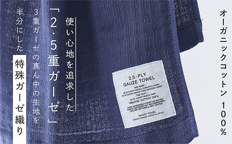 099H3955-1 SHINTO TOWEL「2.5重ガーゼ・ハンドタオル」(ネイビー)2枚セット オーガニックコットン