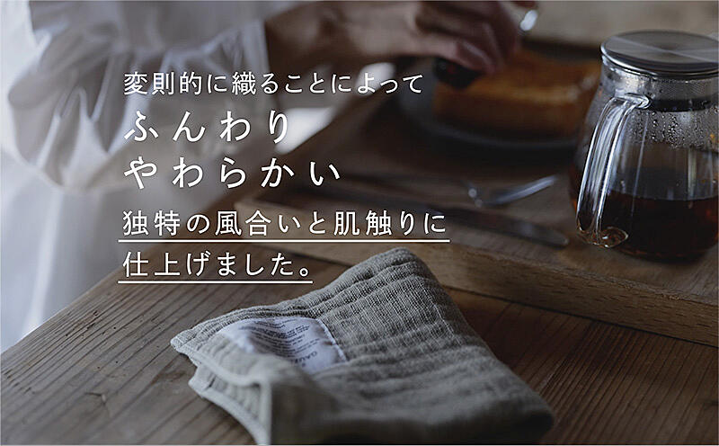 3重ガーゼの真ん中の生地を半分にするという特殊ガーゼ織りによって生まれた「2.5重ガーゼタオル」。変則的に織ることによって、ふんわりとやわらかく、独特の肌触りを実現しました。