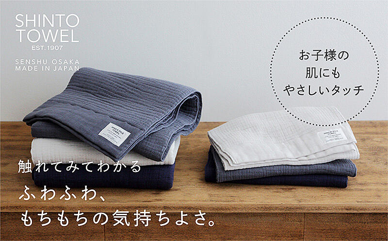 表面のガーゼによる優しい肌触りと、中層のパイルが持つ高い吸水性、パイルがサンドイッチされていることによるふかふかのボリューム感が気持ちいいタオルです。