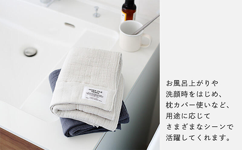 表面のガーゼによる優しい肌触りと、中層のパイルが持つ高い吸水性、パイルがサンドイッチされていることによるふかふかのボリューム感が気持ちいいタオルです。