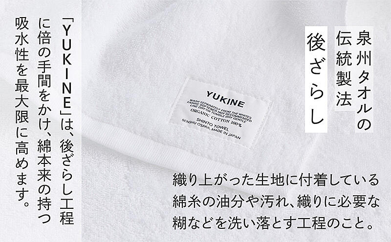 泉州タオルの特長である後ざらしとは、織り上がった生地に付着している綿糸の油分や汚れ、織りに必要な糊などを洗い落とす工程のこと。「YUKINE」は、この後ざらしに倍の手間をかけています。これにより、綿本来の持つ吸水性を最大限に高めました。