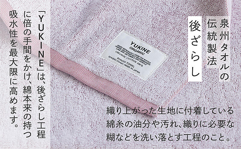泉州タオルの特長である後ざらしとは、織り上がった生地に付着している綿糸の油分や汚れ、織りに必要な糊などを洗い落とす工程のこと。「YUKINE」は、この後ざらしに倍の手間をかけています。これにより、綿本来の持つ吸水性を最大限に高めました。