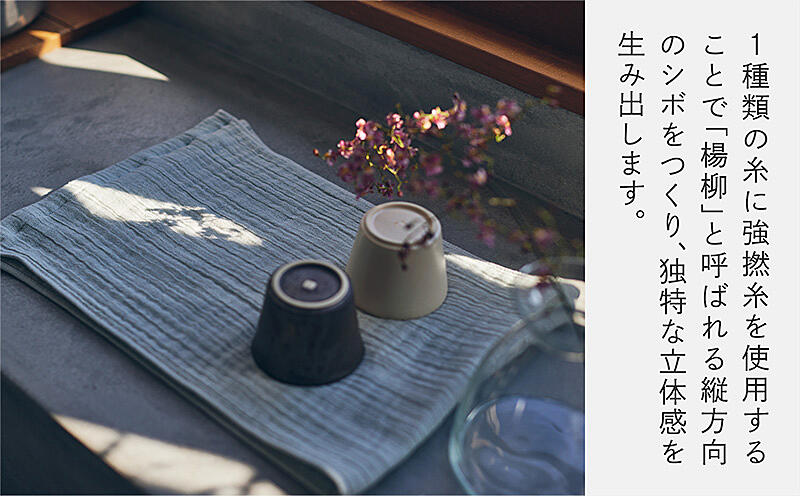 また、1種類の糸に強撚糸を使用することで「楊柳」と呼ばれる縦方向のシボをつくり、独特な立体感を生み出します。