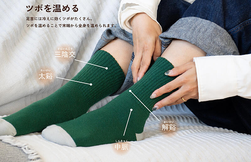 ゆるすぎずきつすぎないちょうどいい締め付け感の履き心地で足首のツボを温め、末端から全身を温められます。