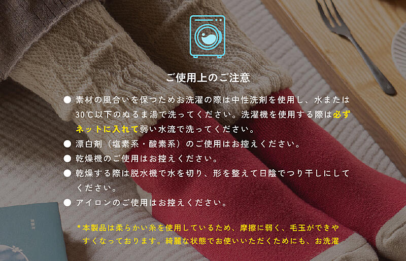柔らかい糸を使用しているため摩擦に弱く、毛玉ができやすくなっております。