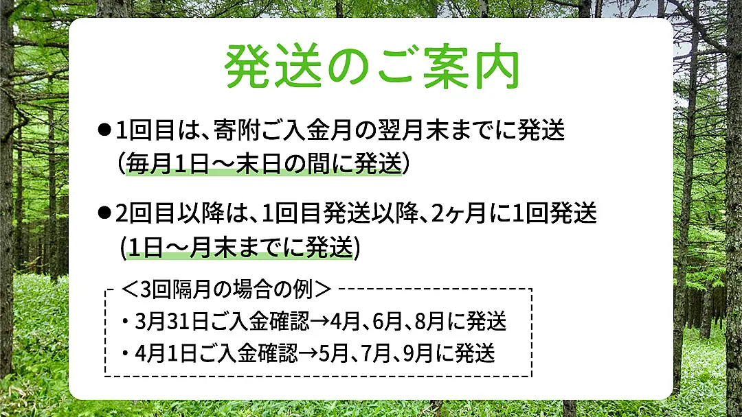 ◎1回目:寄附ご入金月の翌月に発送(1日~月末までに発送)