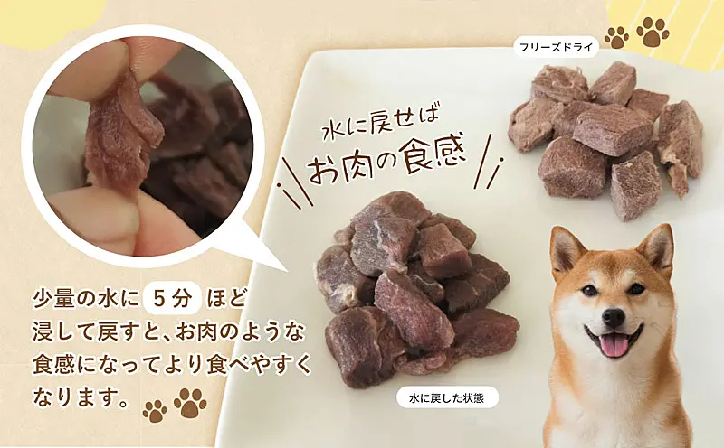 そのままサクサクとした食感で与えても、水で戻してしっとりとした肉本来の食感を楽しむこともできます。