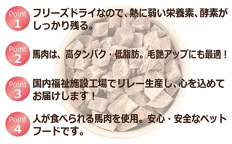 馬肉を100%使用した、フリーズドライのペットフードです。新鮮馬肉をそのままフリーズドライにしました。