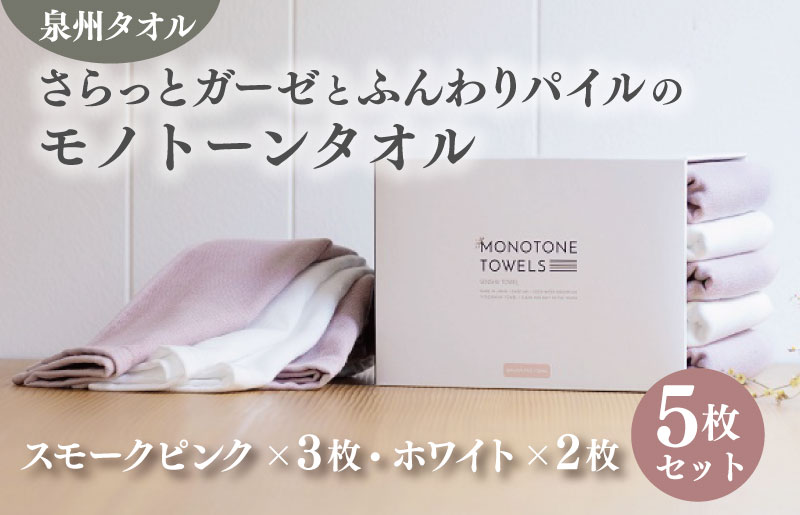 010B1158 さらっとガーゼとふんわりパイルのモノトーンタオル(スモークピンク3枚 ホワイト2枚)