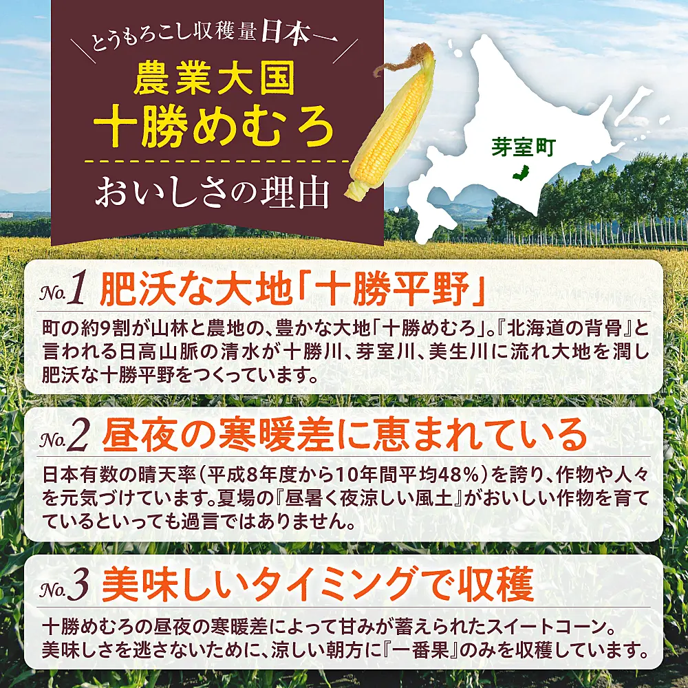 北海道十勝の芽室町は、とうもろこし(スイートコーン)の生産量が全国トップクラスです。十勝平野の雄大な自然に囲まれ、肥沃な大地に恵まれていることから、ジャガイモや枝豆などの農産物が盛んに生産されています。