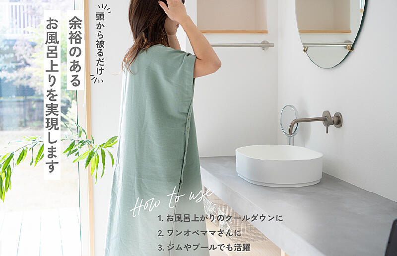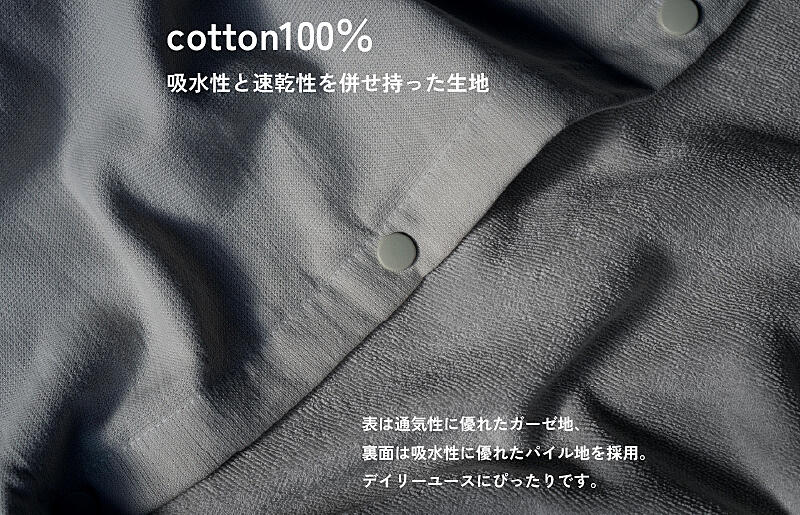 表面は通気性に優れたガーゼ地、裏面は吸水性に優れたパイル地を使用したデイリーユースにぴったりの着るタオルです。