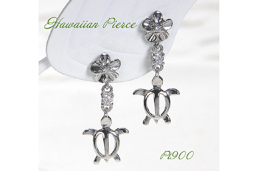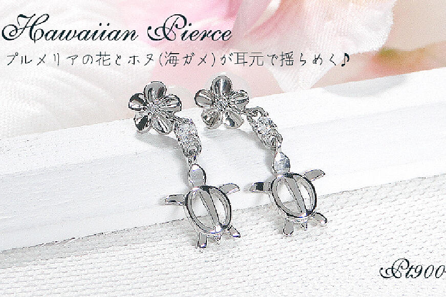 立体感のあるプラチナ900のプルメリアの花に、愛らしいフォルムのウミガメを繋いだ縦長デザインピアス。
