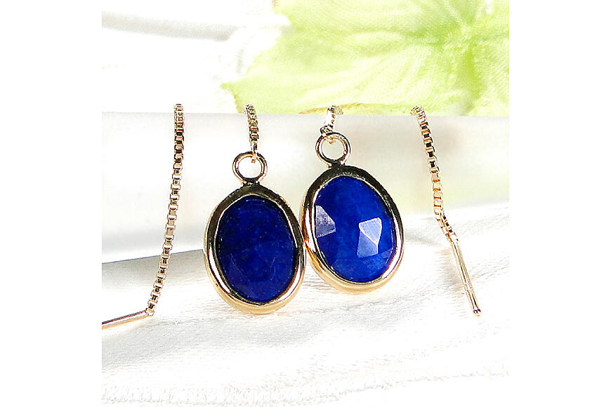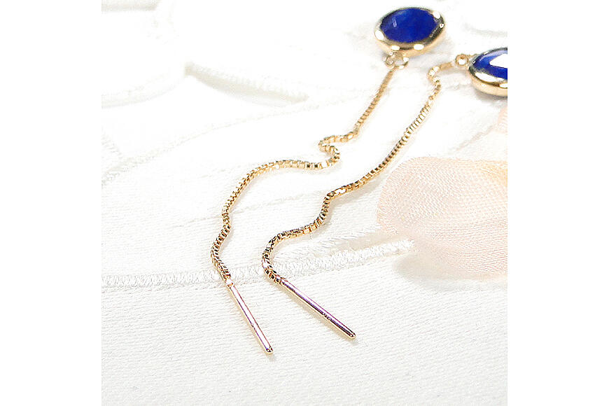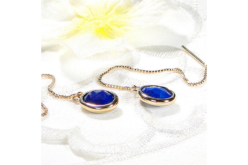 オーバル形のラピスラズリの両面にローズカットを施したロングチェーンピアスです。