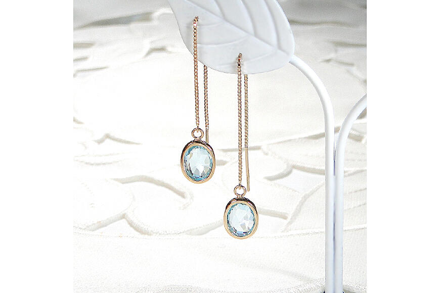 オーバル形のブルートパーズの両面にローズカットを施したロングチェーンピアスです。