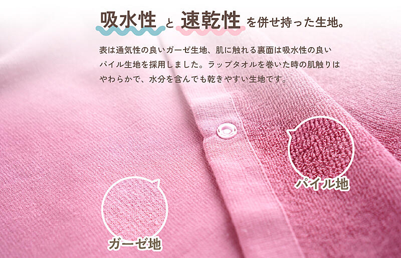表は通気性の良いガーゼ生地、肌に触れる裏面は吸水性の良いパイル生地のラップタオル。