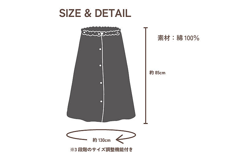 サイズ調整は3段階で 背面は伸縮性のあるゴムギャザーを使用しており、サイズ調節可能なのでどんな体系の方でも◎