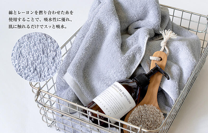 ふんわりと柔らかな使い心地と、一般的な綿100%のタオルでは出せないほどの高い吸水力を兼ね備えています。