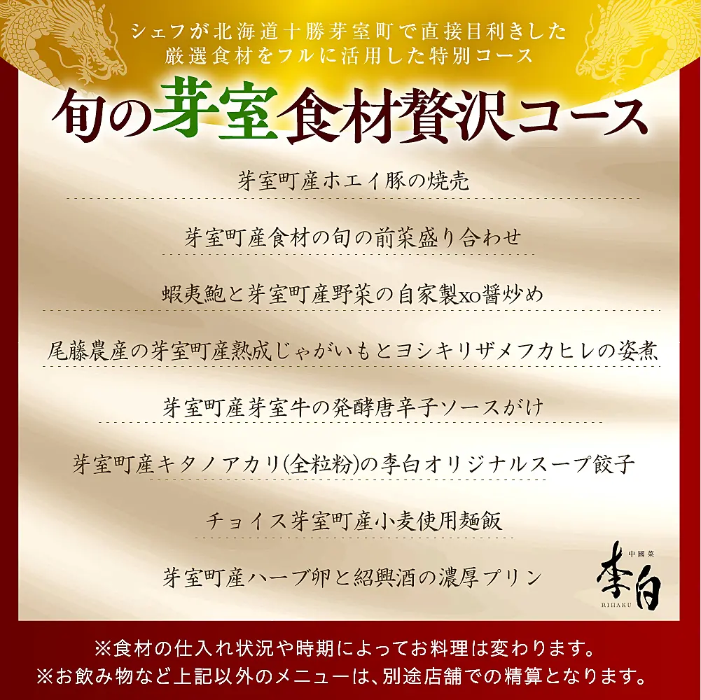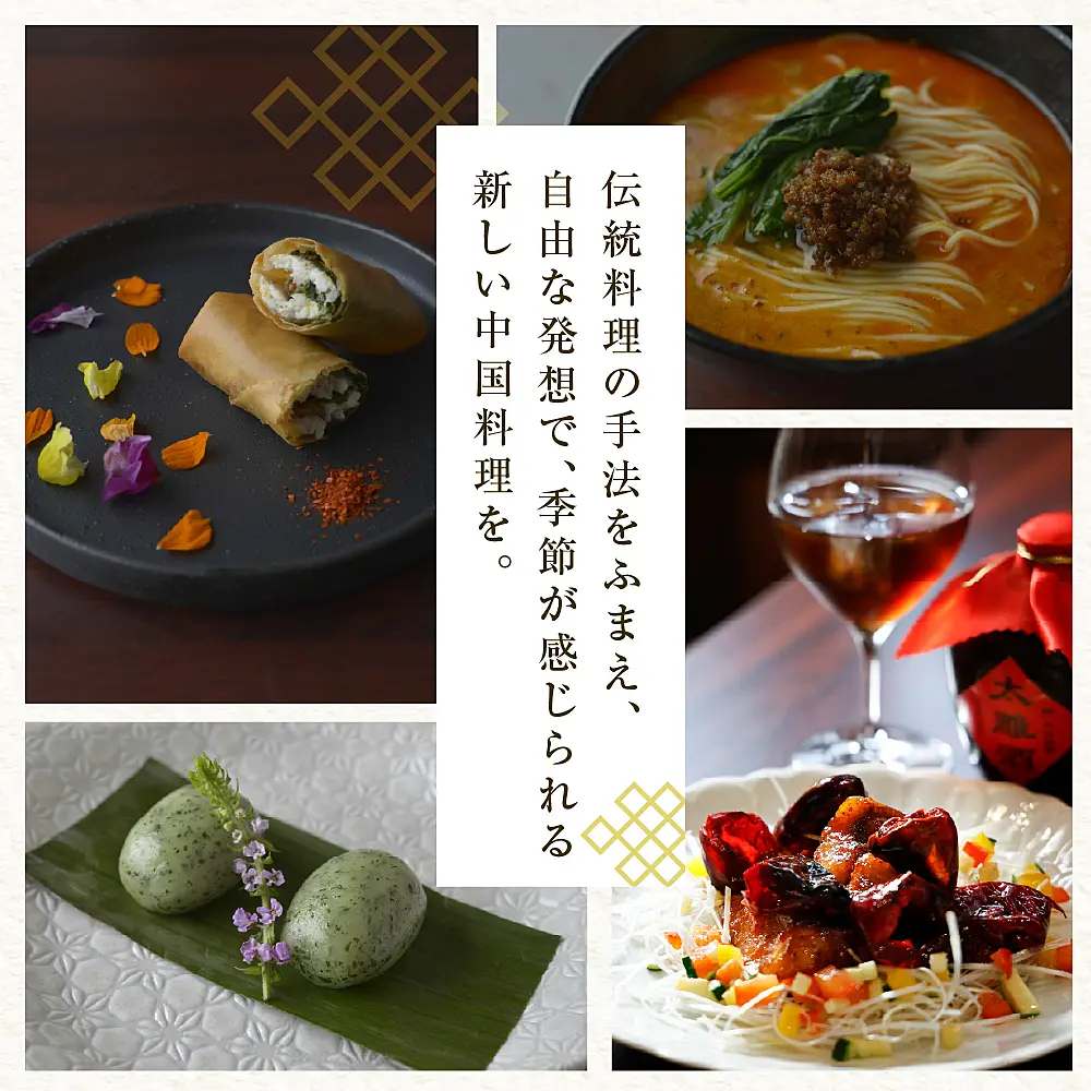 - 【恵比寿 四川料理】中國菜 李白「旬の芽室食材とフカヒレの姿煮入り贅沢コース」食事券1名様分