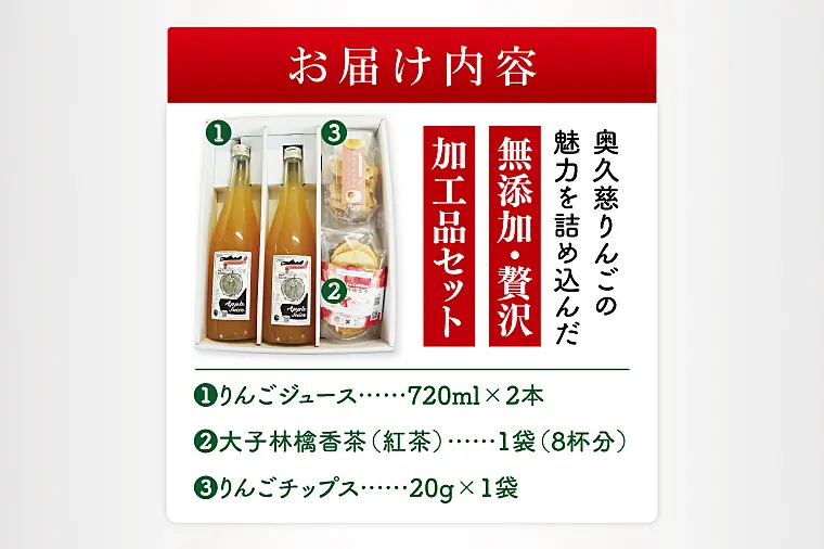 三村観光りんご園が誇る奥久慈りんご尽くしセット(ジュース720ml×2本・林檎香茶1袋・チップス1袋) (BX007)