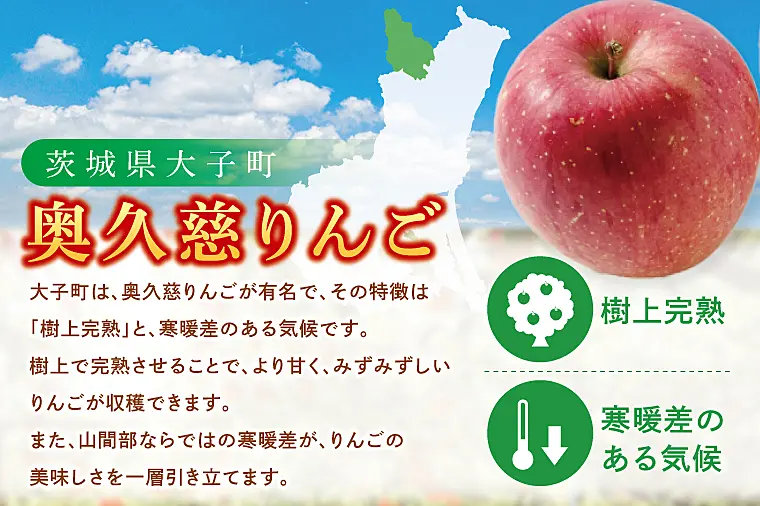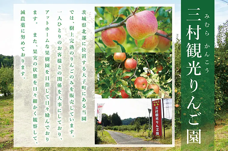 茨城県北部に位置する大子町にある当園では、樹上完熟のりんごのみを販売しています。一人ひとりのお客様との関係を大事にしており、アットホームな果樹園を目指して日々励んでおります。また、果実の状態を日々細かく観察して、減農薬に努めております。