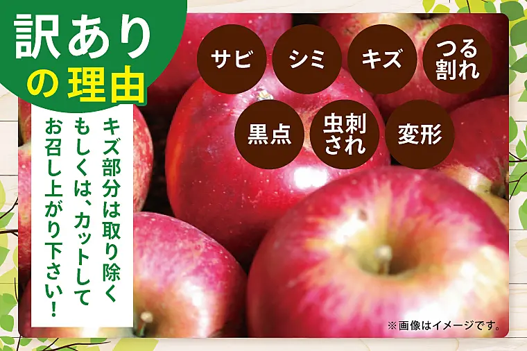 こちらのお礼品は訳あり品のため、サビ、シミ、キズ、つる割れ、黒点、虫さされ、変形などがあり規格外になってしまったりんごです。
