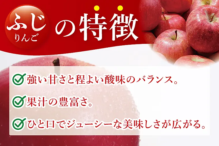 「ふじ」りんごの特徴は、強い甘さと程よい酸味のバランス、そして果汁の豊富さにあります。ひと口でジューシーな美味しさが広がります。