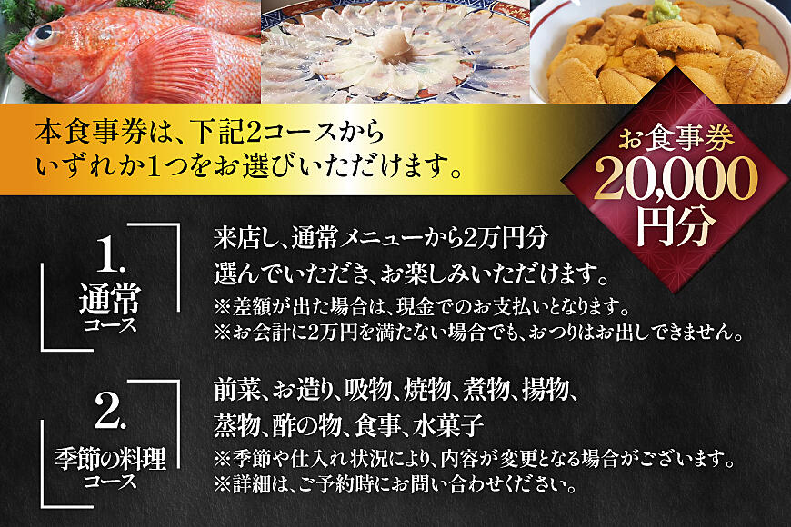 1.通常コース:来店し、通常メニューから2万円分選んでいただき、お楽しみいただけます。