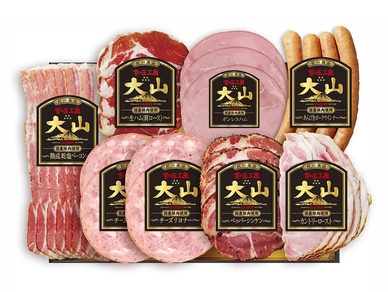 美味しさに定評のあるペッパーシンケン、国産豚肉にチーズを練り込んで仕上げたチーズリヨナー、人気の熟成乾塩ベーコン、ボンレスハム、白樺チップで燻した芳醇な香りの生ハム(肩ロース)、上品であっさりとした味わいが魅力のカントリーロースト、朝食やお弁当と普段使いに便利で人気のあらびきポークウインナーの大山ハムを代表するオリジナル7種8品の詰め合わせです。