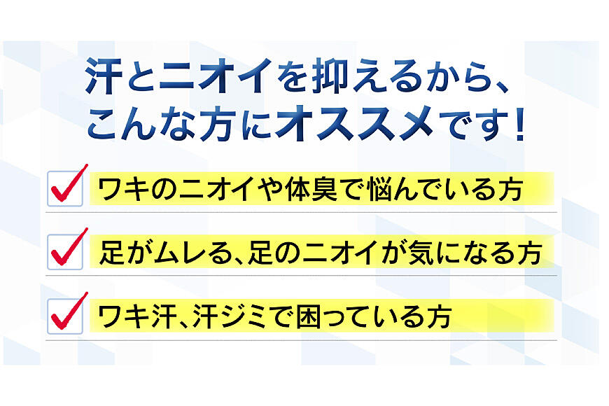 ワキのニオイや体臭で悩んでいる方、ワキ汗や汗ジミで困っている方、足のニオイや蒸れが気になる方などにオススメです。