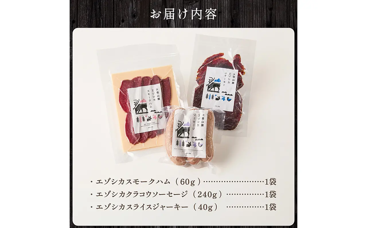 ジビエ加工品3点セット 大雪山麓エゾシカシリーズ (スモークハム・ソーセージ・ジャーキー)