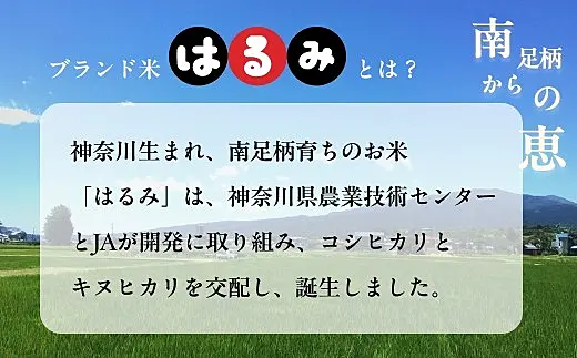 神奈川生まれ、南足柄育ちのお米「はるみ」は、神奈川県農業技術センターとJAが開発に取り組み、コシヒカリとキヌヒカリを交配し、誕生しました。