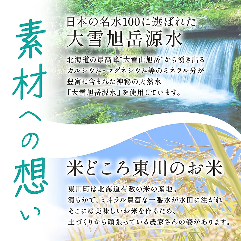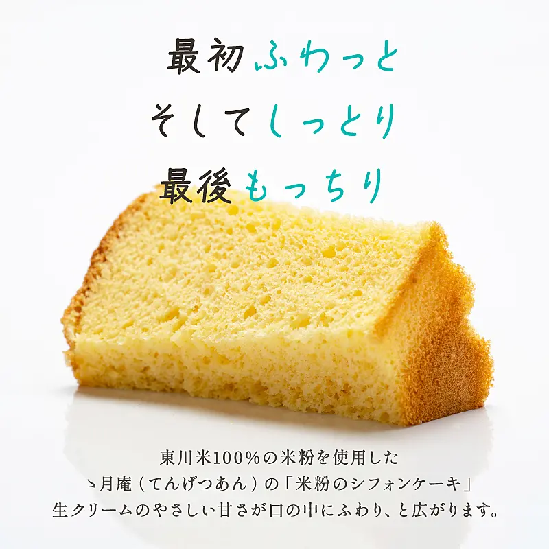 大雪山旭岳の麓、東川町、冬、大雪山に沢山の雪が降り積もり春になるとやがて雪が溶け出す、その水は一番初めに東川の田んぼに入ってくる、そこには美味しいお米を作るため日々努力を続ける農家さん達がいる、そんな思いのこもったお米で食べると最初にふわっと、そしてしっとり、最後にもっちり、水分の多いシフォンケーキとなっております。
