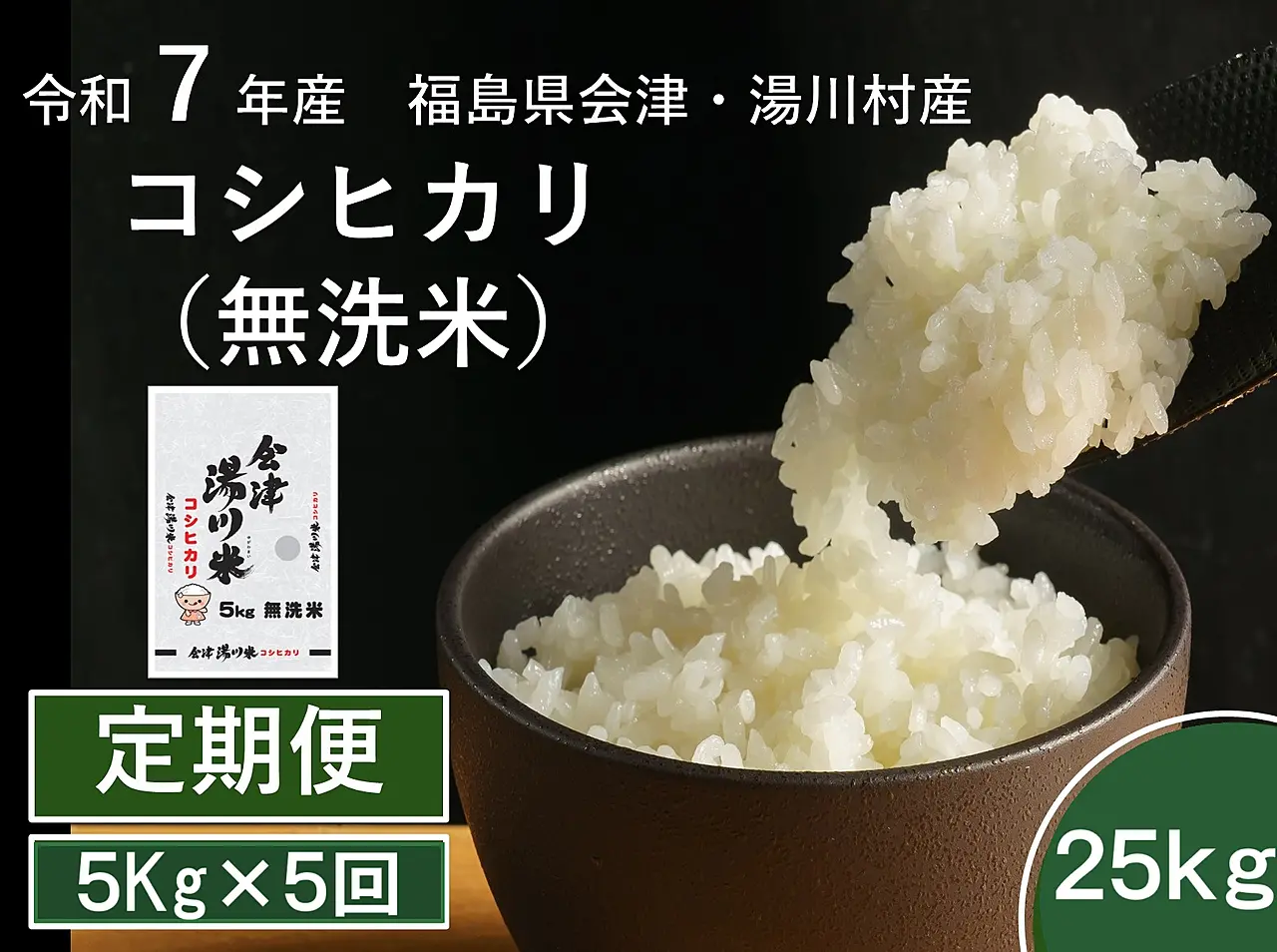 令和7年産湯川村産コシヒカリ 無洗米25kg(5㎏×5回)【全5回定期便 R8.1月・3月・5月・7月・9月発送】