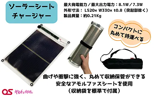 8W(ワット)タイプのソーラーシートチャージャーと防水LEDシャージャー(バッテリー)のセットです。