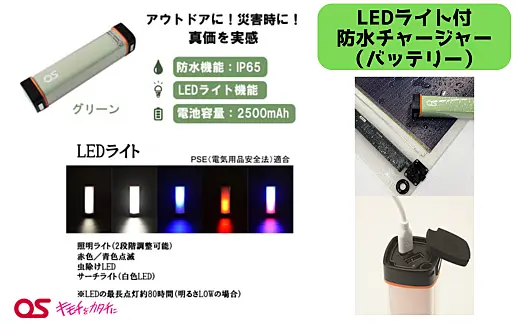 照明(2段階調整)、赤/青点滅、虫よけ、サーチライトの機能を備えたLEDチャージャーを搭載しています。