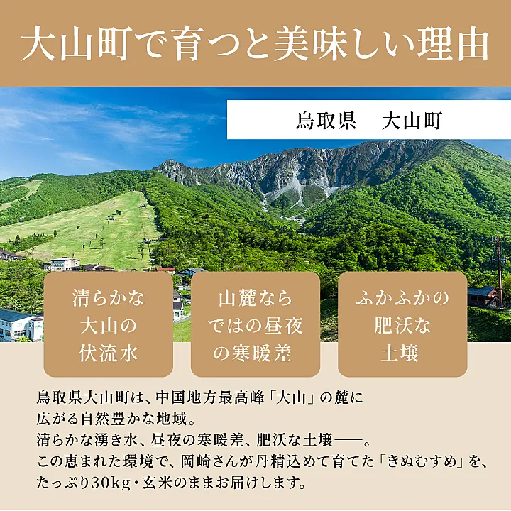 岡崎さんが丹精込めて育てたお米は、粒ぞろいがよく、ほどよい粘りと上品な甘みが特長です。大山町が誇る自慢の味を、たっぷり30kg玄米のままお届けします。