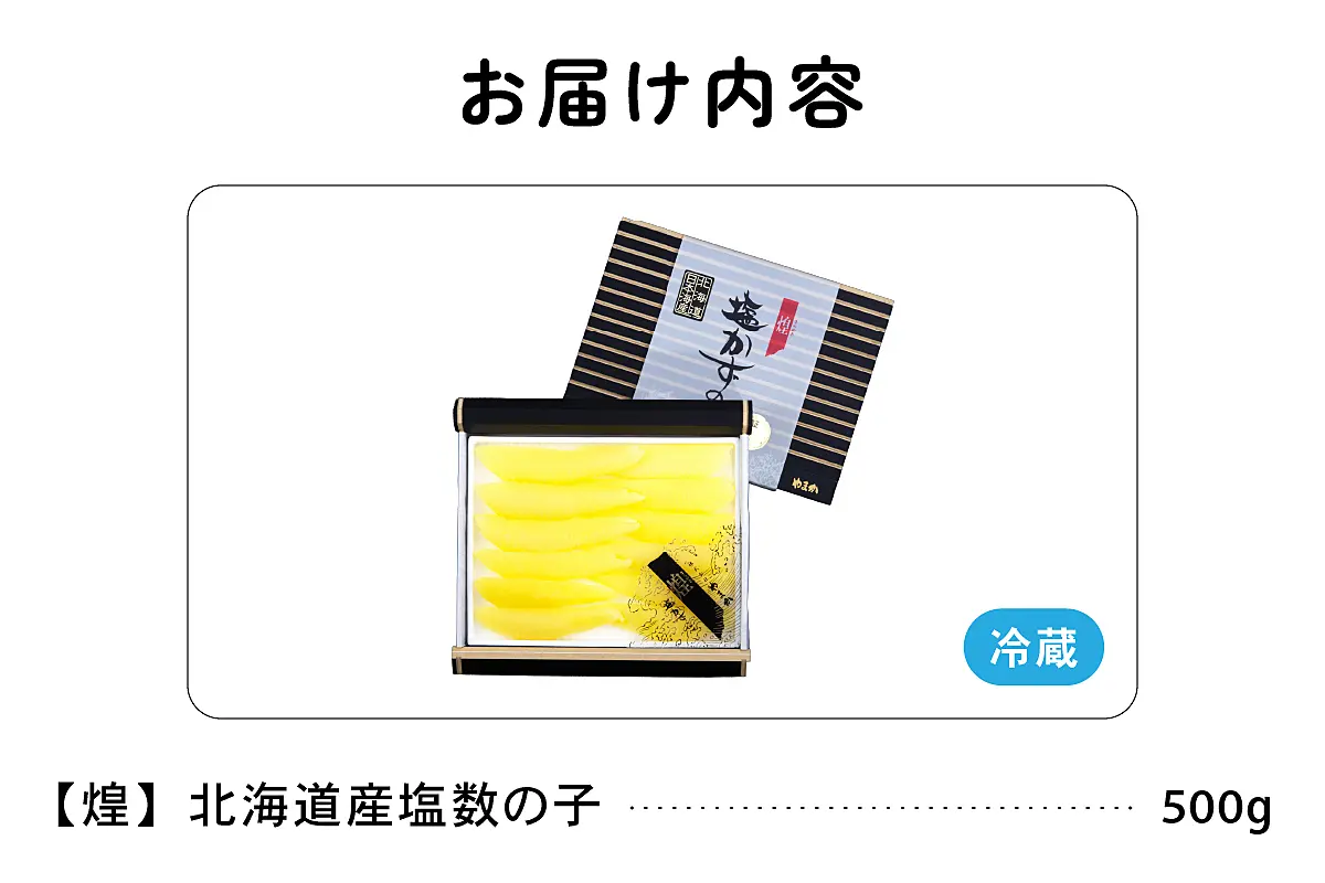 塩数の子【煌】は、北海道沿岸で漁獲された、抱卵ニシンの完熟卵のみを原料として使用しております。選び抜かれた品質の良い原料をもとに職人が作った自信作の数の子をご堪能ください。