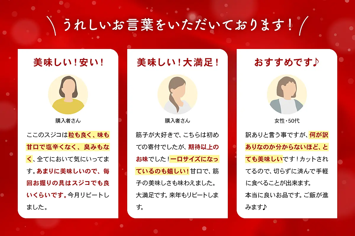 筋子を食べやすいひとくちのサイズにカットしてありますので、解凍後すぐにお召し上がりいただけます。