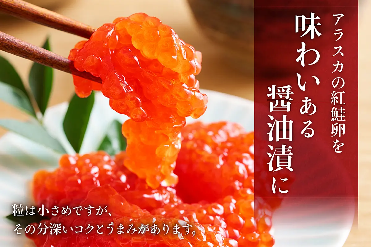 アラスカの紅鮭卵を味わいある醤油漬に仕上げました。サイズが不揃いな訳あり返礼品ではありますが、正規品と同じ製造工程で加工しておりますので、もちろん味は一緒です。