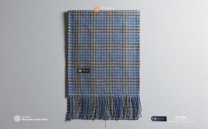 G3564 『Noble Fibre』100%カシミヤ・マフラー ブルー&チェック フリンジ付き【高級 カシミア おしゃれ】