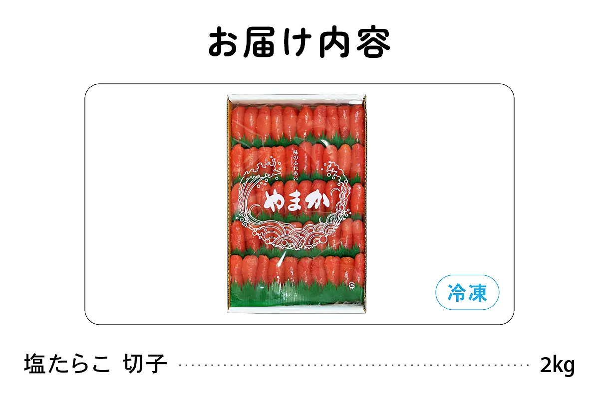 たらこの製造工程中にでてきた「切子」を小分けしやすく並べて2kg詰めました。原料は高品質のアメリカ産たらこを使用しております。塩たらこは原料の鮮度が品質に大きく影響します。そこで選ばれたのが、アメリカ産たらこです。冬のベーリング海で漁獲したスケトウダラから採卵し、急速凍結を行った完熟卵のみを使用しております。素材本来の旨味を引き出す味付に仕上げました。口の中ではじけるプチプチの粒子感と塩たらこの本来の美味しさをご堪能ください。