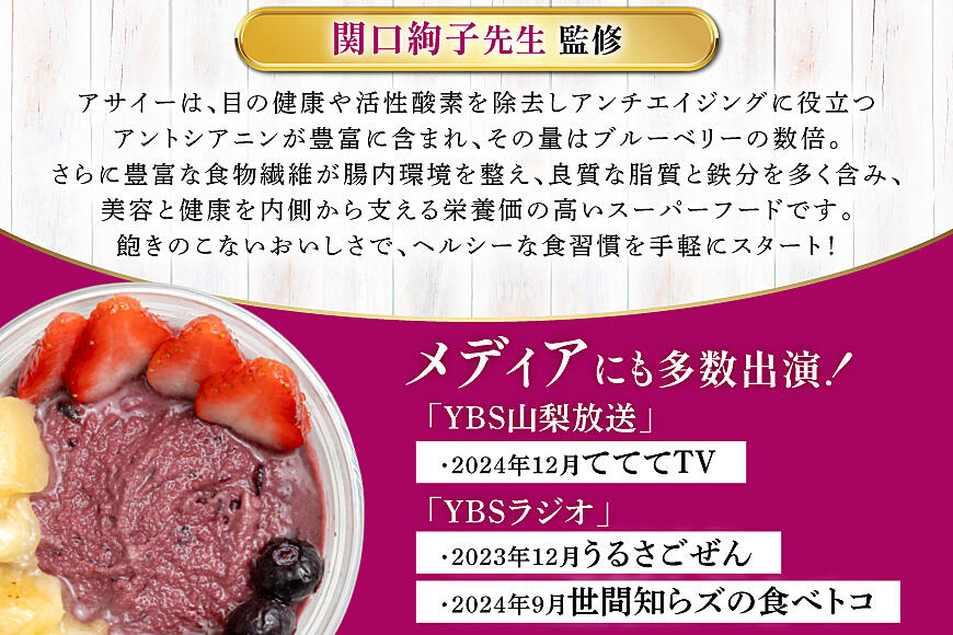 原材料名:アサイー、イチゴ、ブルーベリー、バナナ、ヨーグルト、アップルジュース、ブドウ、グラノーラ、ハチミツ